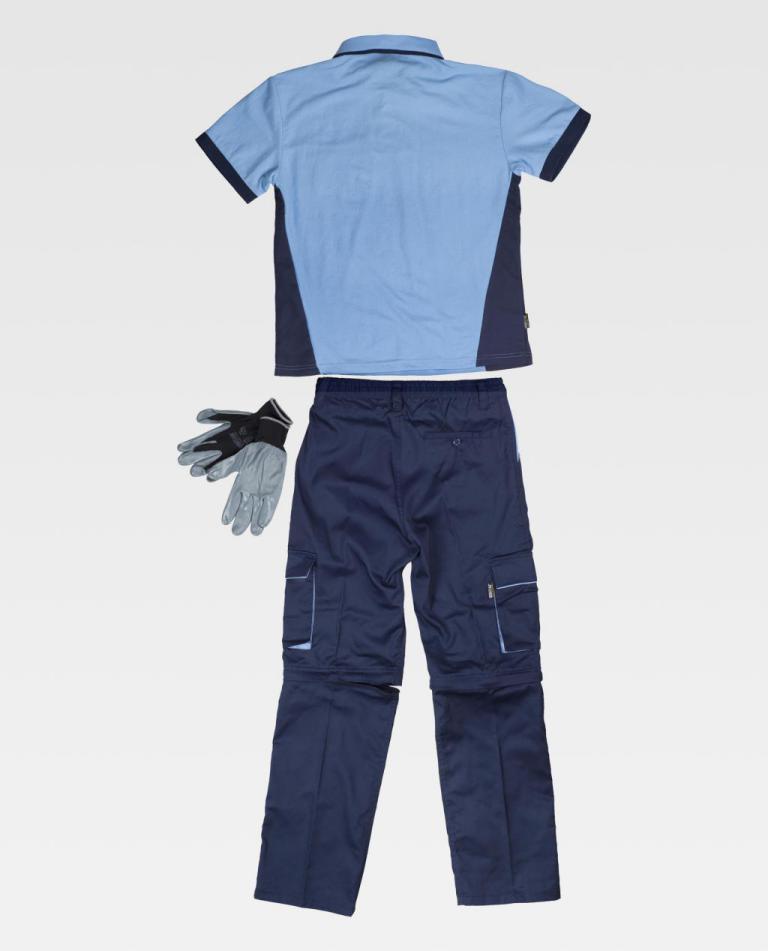 Set de verano: Pantalón: Pantalón combinado desmontable con dos bolsos de abertura inclinada en los costados. Dos bolsos laterales de fuelle con cartera de velcro y vistas a contraste. Un bolso trasero interior con cierre de ojal y botón. Elástico en la cintura. Trabillas. Cierre de botón y bragueta de cremallera. Polo: Polo combinado de manga corta en tejido piqué. Cuello clásico con tapeta de tres botones. Cubrecosturas en el interior del cuello. Un bolso de pecho de ojal. Tejido fresco y poroso que permite una adecuada ventilación. Cuello y acabado de la manga en punto canalé. Guantes: Guante de poliéster sin costuras. Recubierto de nitrilo. Puño elástico. 13GG